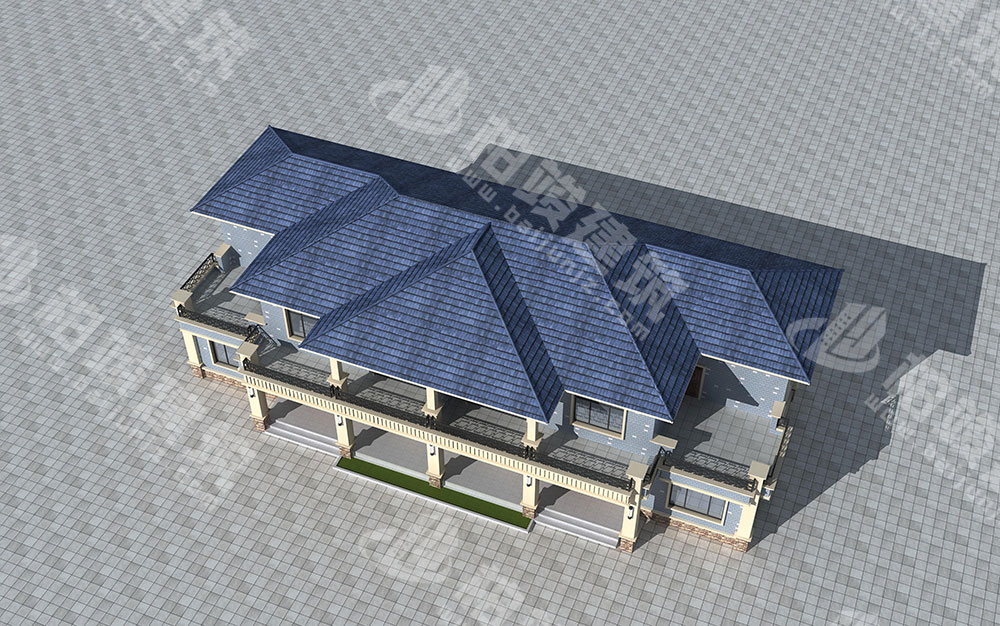 屋顶造型:墨蓝色沥青瓦铺设多立面坡形屋顶,自带粗粝纹路感,清新质朴